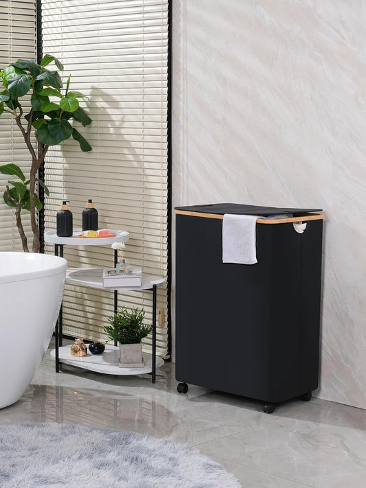 efluky Slim Laundry Basket with Wheels, Narrow Rolling Laundry Hamper with Lid and Removable Bag, Aesthetic Dirty Clothes Hamper on Wheels for Laundry Room, Bedroom, Dorm and Bathroom, 75L Dark Black