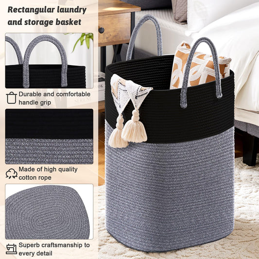 Laundry Basket,Woven Cotton Rope Laundry Hamper,Versatile Storage for Dirty Clothes,Baby Toys,and Blankets in Bathroom, Nursery,and Living Room (Black, 60L)