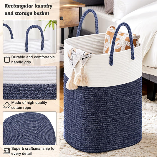 Laundry Hamper 62L,Large Laundry Basket for Clothes,Decorative Storage Basket for Blankets,Cotton Rope Woven basket for bedroom,Navy Blue