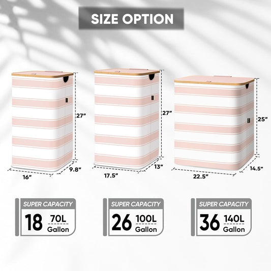 BALEINE Laundry Hamper with Lid, Tall Laundry Baskets with Bamboo Pull Handles, Large Laundry Bin with Internal Support (26 Gal/100L, Pink Stripe)