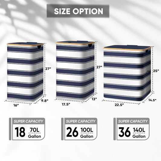 BALEINE Laundry Hamper with Lid, Tall Laundry Baskets with Bamboo Pull Handles, Large Laundry Bin with Internal Support (26 Gal/100L, Blue Stripe)