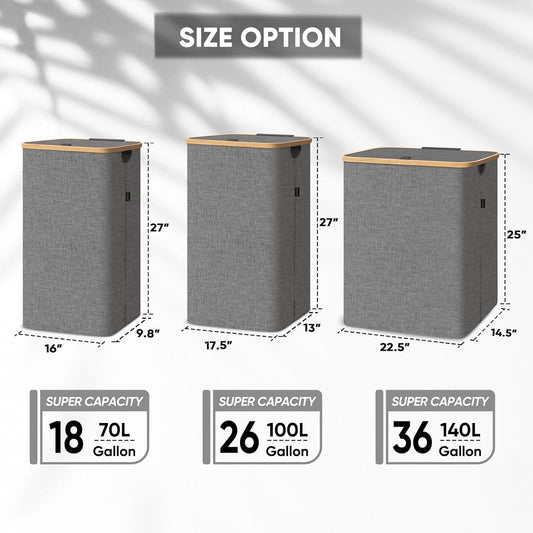 BALEINE Laundry Hamper with Lid, Tall Laundry Baskets with Bamboo Pull Handles, Large Laundry Bin with Internal Support (26 Gal/100L, Grey)