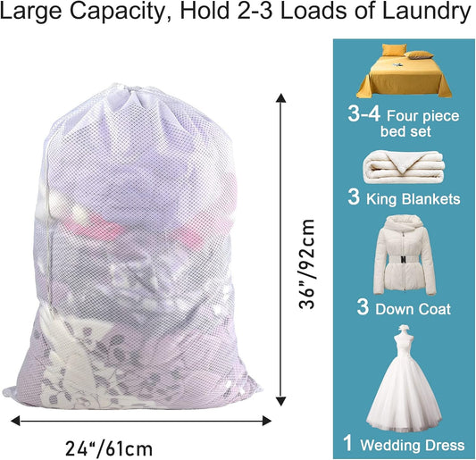 Polecasa Extra Heavy Duty Large Diamond Mesh Laundry Bags with Drawstring Closure & ID Tag, 24 x 36 inches Washable Storage Bag, Laundry Accessory for Hamper, College, Travel, Sports, Dorms, White