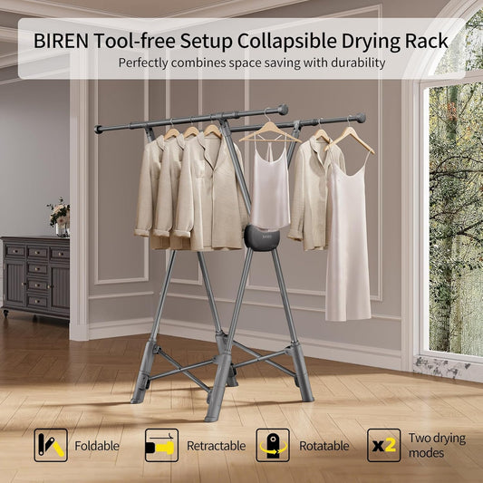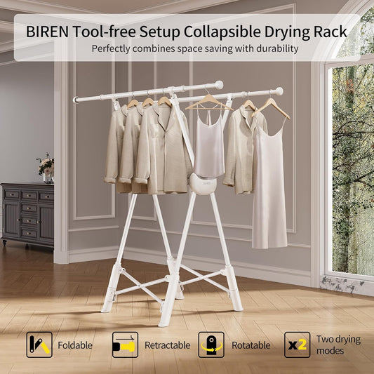BIREN Clothes Drying Rack Heavy Duty Clothing Racks Extending Laundry Rack Two Drying Modes Garment Racks for Drying Clothes, Adjustable Length from 32-55 Inches for Indoor Outdoor Use