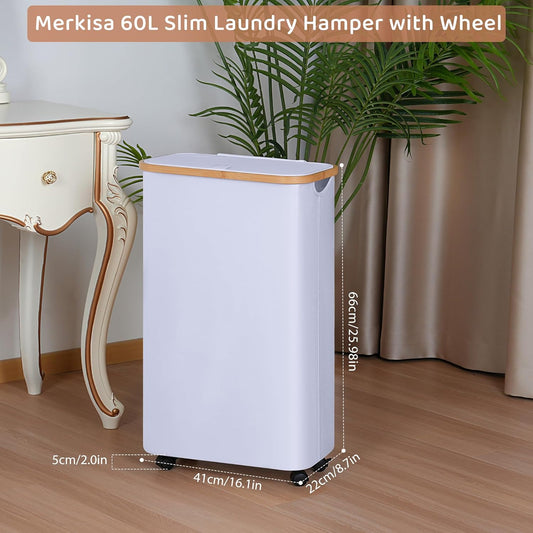 Slim Laundry Basket with Wheels,Narrow Hampers for Laundry,Freestanding Laundry Hamper with Lid&Bamboo Handles,Collapsible & Waterproof Tall Cloth Hamper for Dorm Family(60L White)