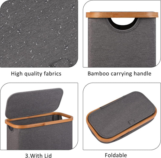Slim Laundry Basket,60L Laundry Hamper with Lid, Tall Hamper for Laundry,Dirty Cloth Hamper with Bamboo Handle for Toys,Towels, Clothes Organizing,Grey