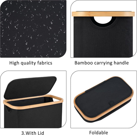 60L Slim Laundry Hamper,Laundry Basket with Lid,Tall Hamper for Laundry,Dirty Cloth Hamper with Bamboo Handle for Toys,Towels, Clothes Organizing,Black