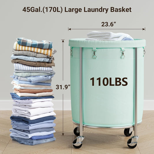 ELYKEN Laundry Basket with Wheels, 170L Rolling Laundry Hamper with Removable Bag and Steel Frame, Round Laundry Cart with 4 Casters and 2 Brakes, Ideal for Bedroom, Bathroom, Laundry Room, Mint Green