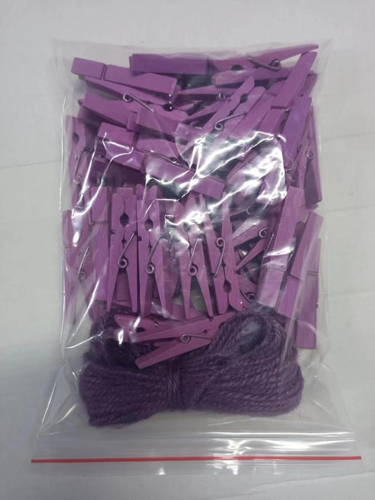 1.9 Inch Purple Wooden Clothes Pins with Strong Craft String for Pictures Papers Peg Photo Display Shirt Clips Pack 50