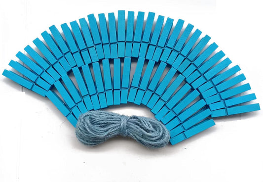 1.9" Wooden Clothespins Hanging Clothes Pins Clip Photo Holder DIY Gift Festive Party Decor with Bright Blue Jute Twine Pack 50