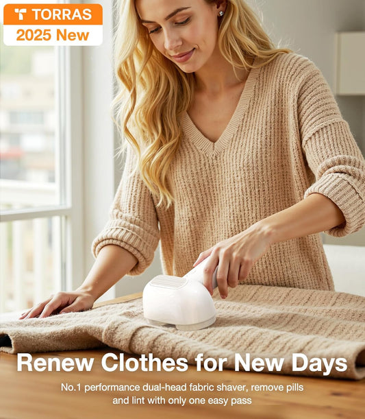 TORRAS Dual-Head Fabric Shaver, Longest Durability & 50ml Large Capacity Rechargeable Lint Removers to Remove Pills, 6-Leaf Blades Defuzzer, Electric Shaver for Clothes Couch Furniture, Pearl White