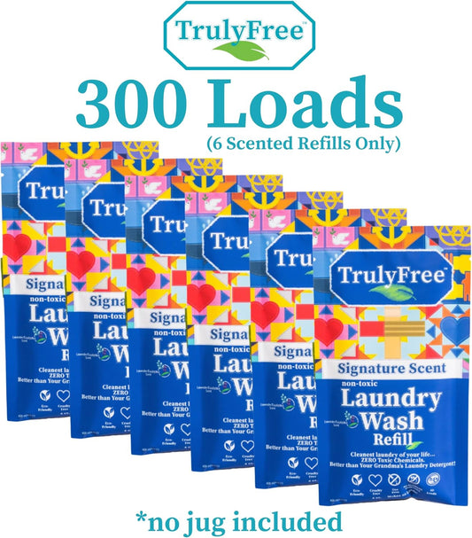Truly Free Natural Laundry Detergent for Sensitive Skin | Eco Friendly, Plant Based, Baby Clothes Safe | Clean & Easy Powder to Liquid, 6 Pack Refill Detergent, NO Jug | Signature Scent, 300 Loads