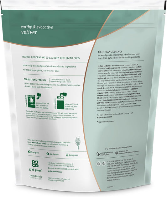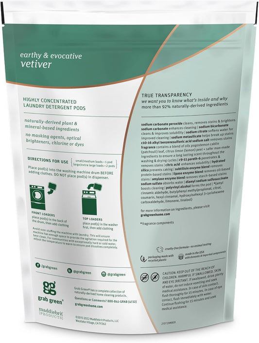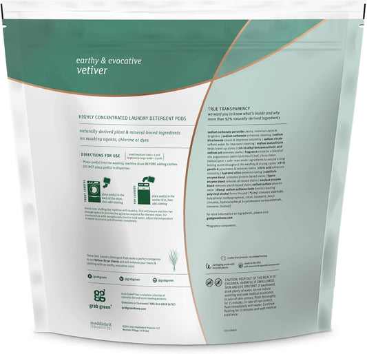 Grab Green 3-in-1 Laundry Detergent Pods, 60 Count, Vetiver Scent, Plant and Mineral Based, Superior Cleaning Power, Stain Remover, Brightens Clothes