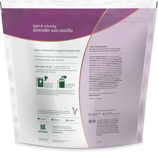Grab Green 3-in-1 Laundry Detergent Pods, 132 Count, Lavender Vanilla Scent, Plant and Mineral Based, Superior Cleaning Power, Stain Remover, Brightens Clothes