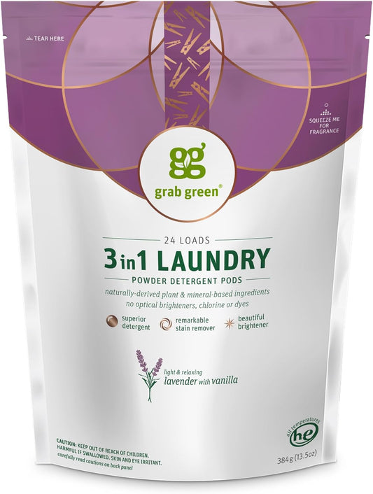 Grab Green 3-in-1 Laundry Detergent Pods, 24 Count, Lavender Vanilla Scent, Plant and Mineral Based, Superior Cleaning Power, Stain Remover, Brightens Clothes