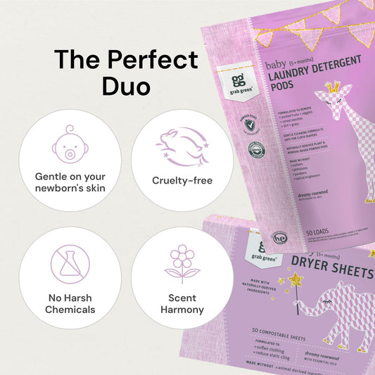 Grab Green Baby Laundry Detergent Pods and Dryer Sheets Bundle, 50 Count Pods and 80 Dryer Sheets, Dreamy Rosewood Scent, Plant and Mineral Based Laundry Care Set