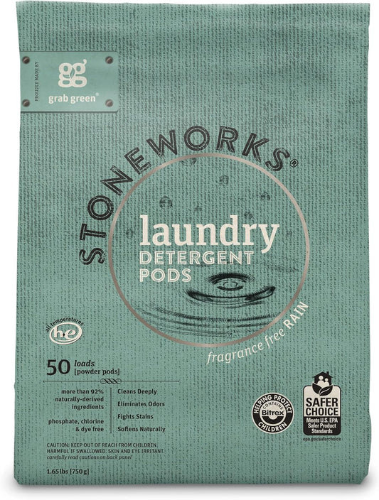 Grab Green Stoneworks Laundry Detergent Pods and Dryer Sheet Bundle, 50 Count Pods and 80 Dryer Sheets, Fragrance Free Rain Scent, Plant and Mineral Based Laundry Care Set