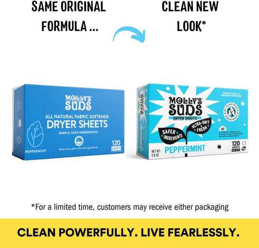 Molly's Suds Fabric Softener Dryer Sheets for Sensitive Skin | Plant-Based Static Reducer, Plastic-Free Packaging | Bundle of 2, Peppermint (240 Sheets Total)