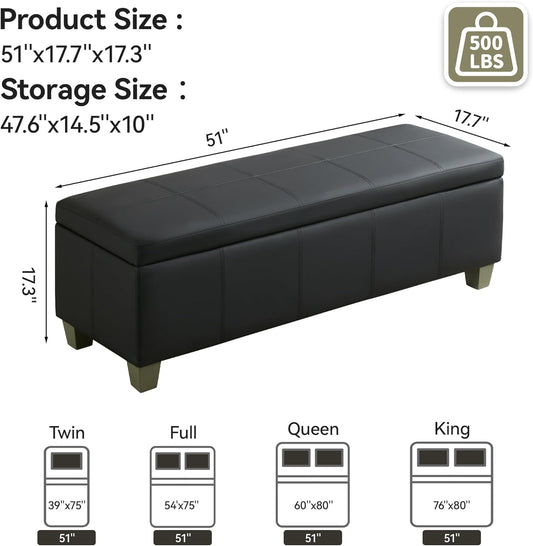 51" Faux Leather Storage Ottoman, Stitch Tufted Rectangle Upholstered End of Bed Storage Bench, Entryway Large Couch Ottoman with Wooden Legs, Dark Black