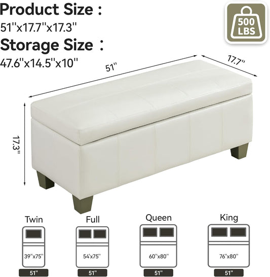 51" Faux Leather Storage Ottoman, Stitch Tufted Rectangle Upholstered End of Bed Storage Bench, Entryway Large Couch Ottoman with Wooden Legs,White