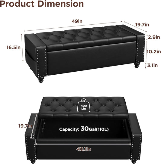 Maupvit Storage Ottoman Bench, 49 Inch Bedroom Bench, Upholstered Ottoman with Storage, Entryway Bench with Tufted Button, Faux Leather Window Bench for Bedroom, Living Room, Entryway, Hallway, Black