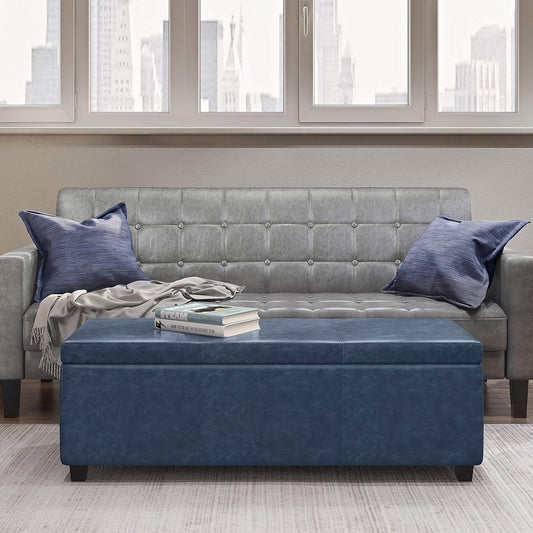 SIMPLIHOME Avalon 42 inch Wide Contemporary Rectangle Storage Ottoman in Distressed Dark Blue Vegan Faux Leather, Assembled, for the Living Room, Entryway and Family Room
