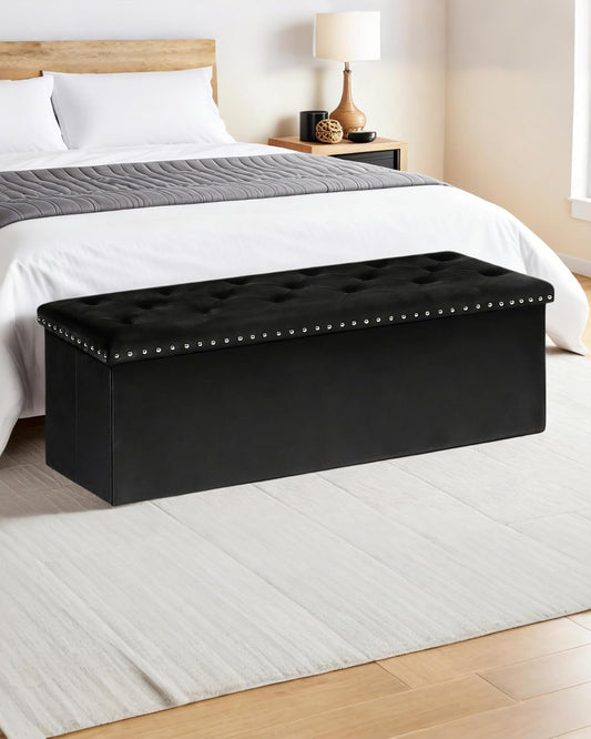 Velvet Storage Ottoman Bench, 43.3" Folding Ottoman with Rivet Trim, Heavy-Duty Upholstered Entryway Bench, Sturdy Footrest and Seat for Bedroom, Living Room, Holds up to 660 LBS, Black