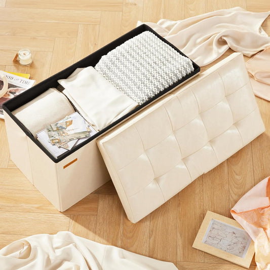 HAUSFRAU - 30 Inches Storage Ottoman Bench with Flipping Lid, Foldable Storage Chest Foot Rest for Living Room, Bedroom, Entryway, Load 660 lb, Synthetic Leather, Ivory