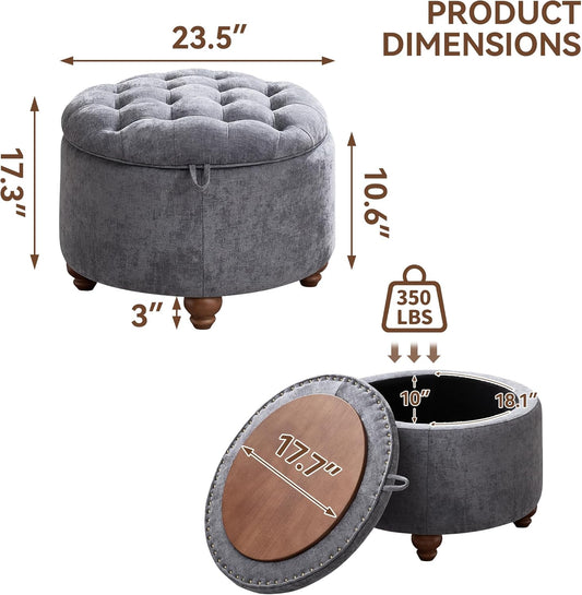 24Inch Round Storage Ottoman with Tray, Modern Tufted Fabric Circle Coffee Table with Storage, Upholstered Ottoman with Removable Top for Living Room, Bedroom, Dark Grey