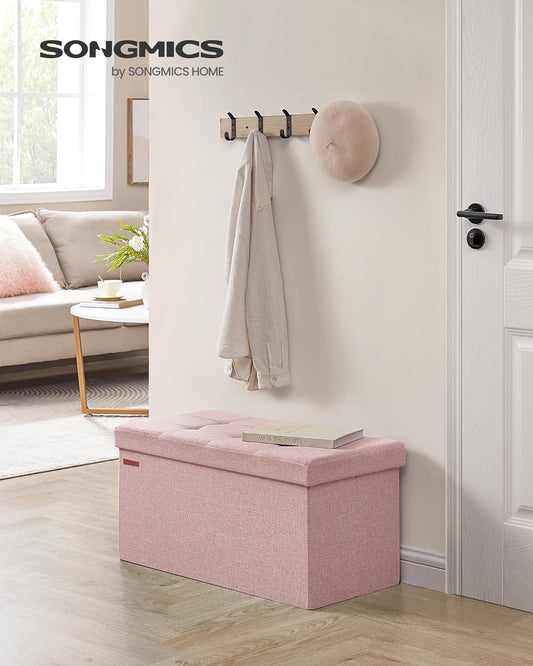 SONGMICS Mazie Collection - 30 Inches Folding Storage Ottoman Bench, Ottoman Foot Rest, End of Bed Bench, Storage Chest, Load 660 lb, for Living Room, Bedroom, Entryway, Jelly Pink ULSF047R11
