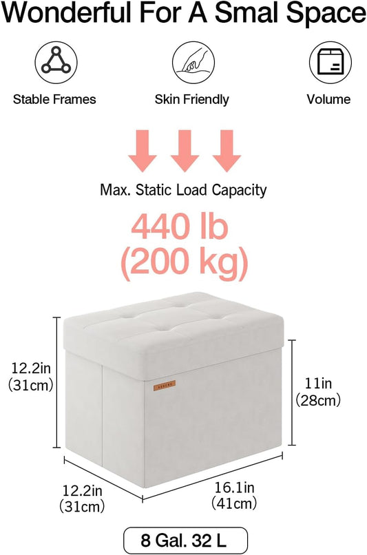 Folding Storage Ottoman, Velvet Storage Bench, Footrest, End Stool, Foot Stool,for Living Room, Bedroom and Office,12.2 x 16.1 x 12.2 Inches, 300 kg Load Capacity,Cream White, UASND03W
