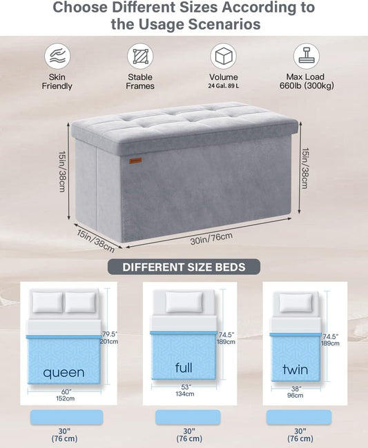 Folding Storage Ottoman, Velvet Storage Bench, Footrest, Removable Divider, for Living Room, Bedroom, 15 x 30 x 15 Inches, 660 lb Load Capacity, Dove Gray UASND01G