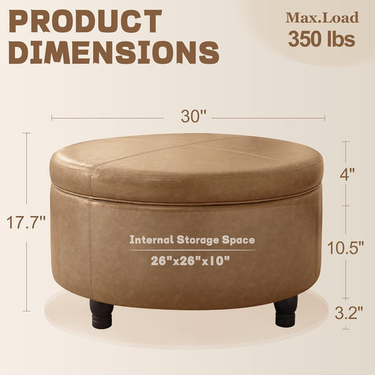 30-Inch Round Storage Ottoman, Modern Ottoman Coffee Table with Removable Top for Living Room, Bedroom, Office (Light Brown)