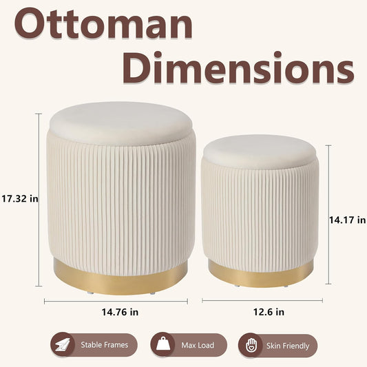 Round Ottoman with Storage Set of 2,Vanity Stool with Storage for Bedroom, Ottoman Coffee Table,Small Velvet Foot Stool for Living Room, Beige