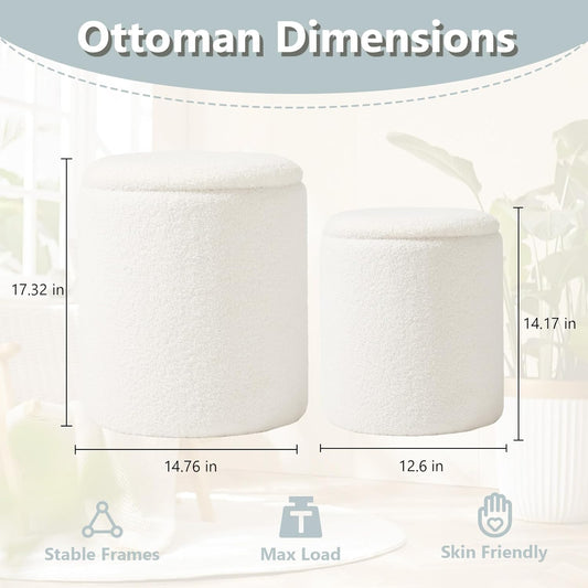 Boucle Round Ottoman with Storage Set of 2,Small Foot Stool Ottoman for Living Room, Small Coffee Table,Vanity Stool with Storage for Bedroom, White