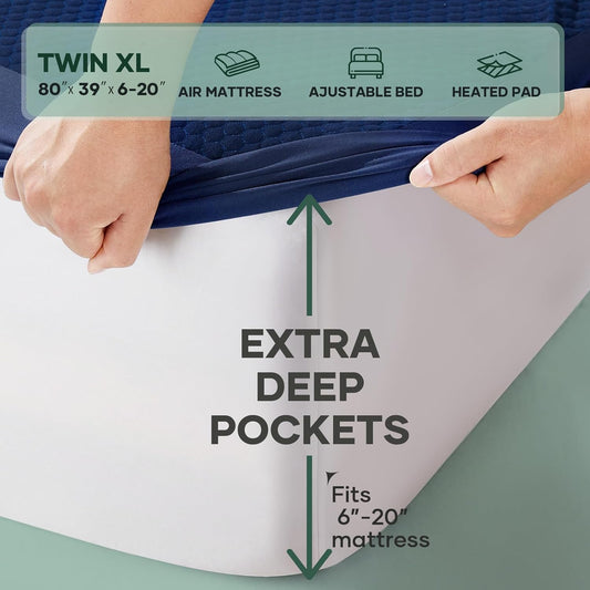 OhGeni 100% Waterproof Mattress Protector, Twin XL Size Mattress Pad, Fits 6"-20" Mattresses with Deep Pocket, Cooling, Breathable Fitted Sheets, Soft Bed Cover, Noiseless, Machine Washable(Navy Blue)