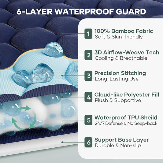 OhGeni 100% Waterproof Mattress Protector, Cal King Size Mattress Pad, Fits 6"-20" Mattresses with Deep Pocket, Cooling, Breathable Fitted Sheets, Soft Bed Cover, Noiseless, Washable(Navy Blue)