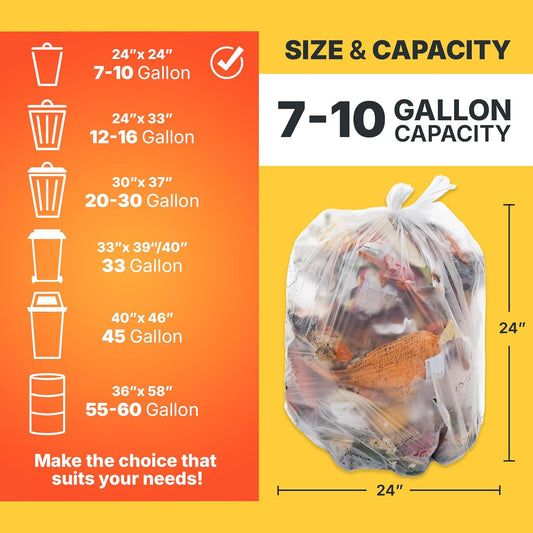 7-10 Gallon Trash Bags, 8 Micron High Density Garbage Can Liners Bulk, 24" x 24", Natural Clear, 1000 Count