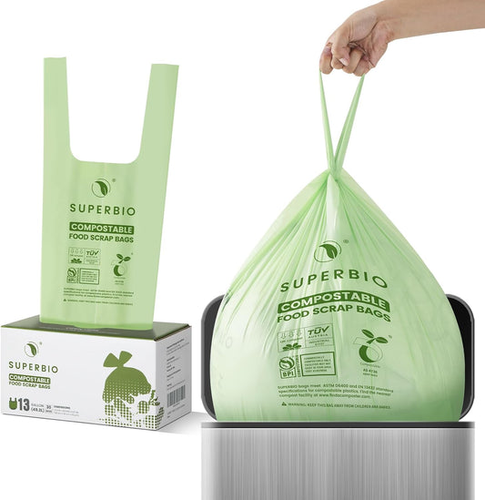 SUPERBIO 13 Gallon Handle Tie Compostable Food Waste Bags, 30 Count, 2 Pack, ASTM D6400, BPI and OK compost INDUSTRIAL, 49.2L, 0.87 Mil