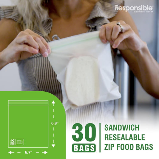 Responsible Products Certified Compostable SANDWICH Resealable Zip Bag, Extra Strength Food Bags, Plant-Based Freezer-Safe (30 Pack)