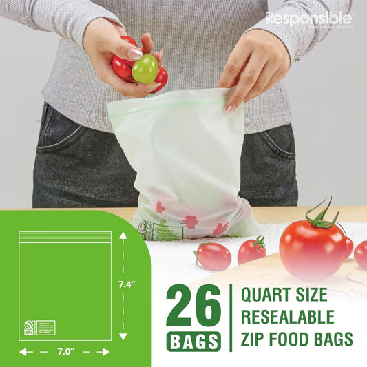 Responsible Products Certified Compostable QUART Resealable Zip Bag, Extra Strength Food Bags, Plant-Based Freezer-Safe (26 Pack)
