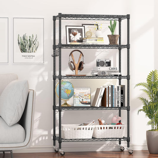 Himimi 5-Tier Storage Shelf Wire Shelving Unit on Wheels Heavy Duty Metal Shelves Adjustable Steel Rack Organization for Kitchen Garage Basement, Black