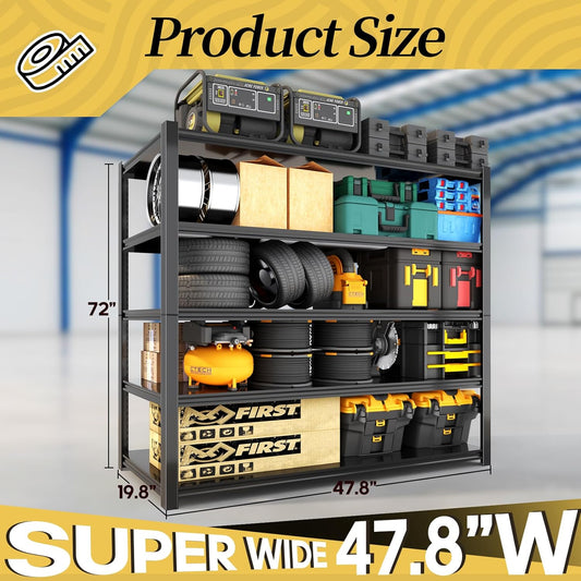 47.8" W Heavy Duty Garage Shelving 3000LBS Storage Shelves, Adjustable 5-Tier Storage Rack, Metal Shelves for Garage/Warehouse/Basement, 47.8" W x 19.8" D x 72" H, 4 Pack
