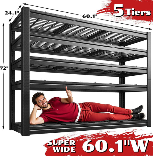 60.1" W Garage Shelving 3125LBS Metal Shelving Extra Wide Storage Shelves Adjustable 5 Tier Garage Shelves Industrial Metal Shelf for Basement Warehouse Shop 60.1" W x 24.1" D x 72" H