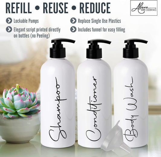 Alora 32oz Reusable Shampoo and Conditioner Bottles - Set of 3 - Easy to Read Labels - Pump Bottle Dispenser for Shampoo, Conditioner, Body Wash - Empty Plastic Refillable Containers for Shower