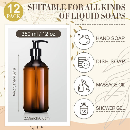 Tessco for you 12 Pack Amber Soap Dispenser Empty Plastic Pump Bottles Dispenser Refillable Shampoo Container for Hand Sanitizer Soap Lotion Body Wash Conditioner Bathroom Kitchen Travel(12 oz)