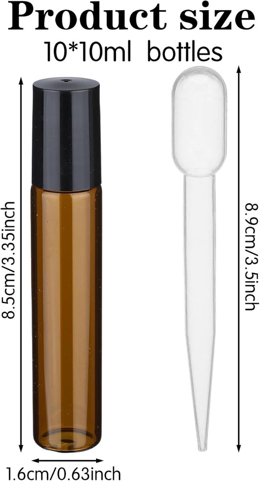 10pcs Amber Essential Oil Roller Bottles, 10ml Roller Bottles for Essential Oils, Refillable Roller Balls for Essential Oils, with Stainless Steel Roller Balls, 2 Droppers for Travel, Perfume and Lip