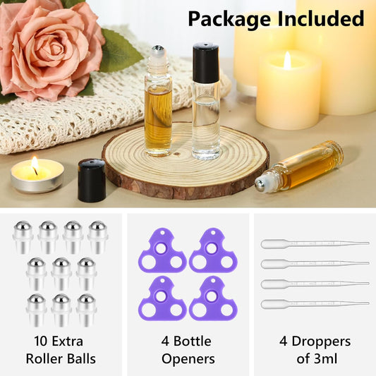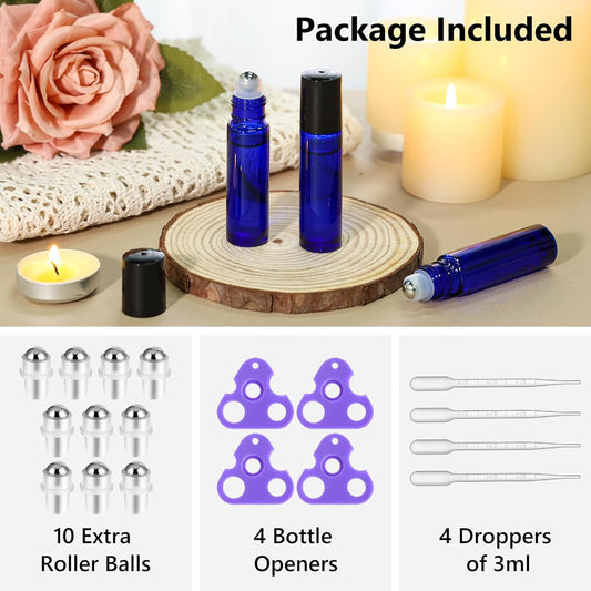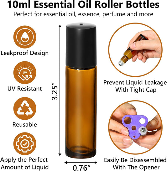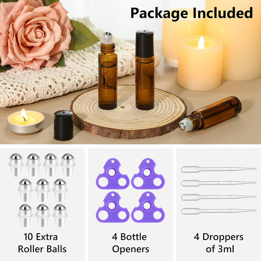10ML Roller Bottles for Essential Oil, 4 Pack Empty Amber Glass Roller Bottle for Perfume Oil, Roll on Bottles with Stainless Steel Roller Balls, Opener, Funnel and Dropper