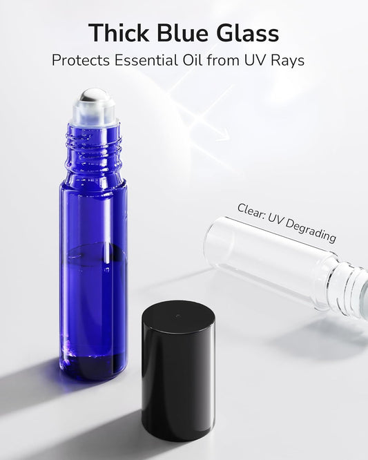 ULG Essential Oil Roller Bottles 48 Pack 10ml Cobalt Blue Glass Empty Bottles with Stainless Steel Roller Balls (10 Extra Roller Balls, 4 Openers, 4 Droppers, 48 Waterproof Labels)