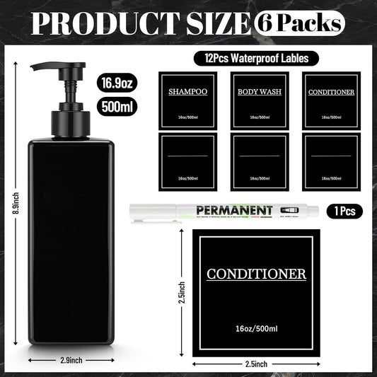 Tanlade 6 Pcs Shampoo and Conditioner Dispenser Bottles 16oz Modern Shower Soap Bottles with Pump, Labels and Marker Pen Easy to Refill Body Wash Dispensers for Home Bathroom Decoration (Black)